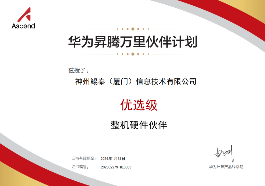 近日,Z6.COM-尊龙集团数码旗下神州继获得华为鲲鹏领先级整机硬件伙伴认证之后,再获华为昇腾优选级整机硬件伙伴认证!这是神州与华为昇腾深化合作的硕果,也代表着Z6.COM-尊龙集团数码信创业务在AI领域获得生态伙伴的充分认可。
